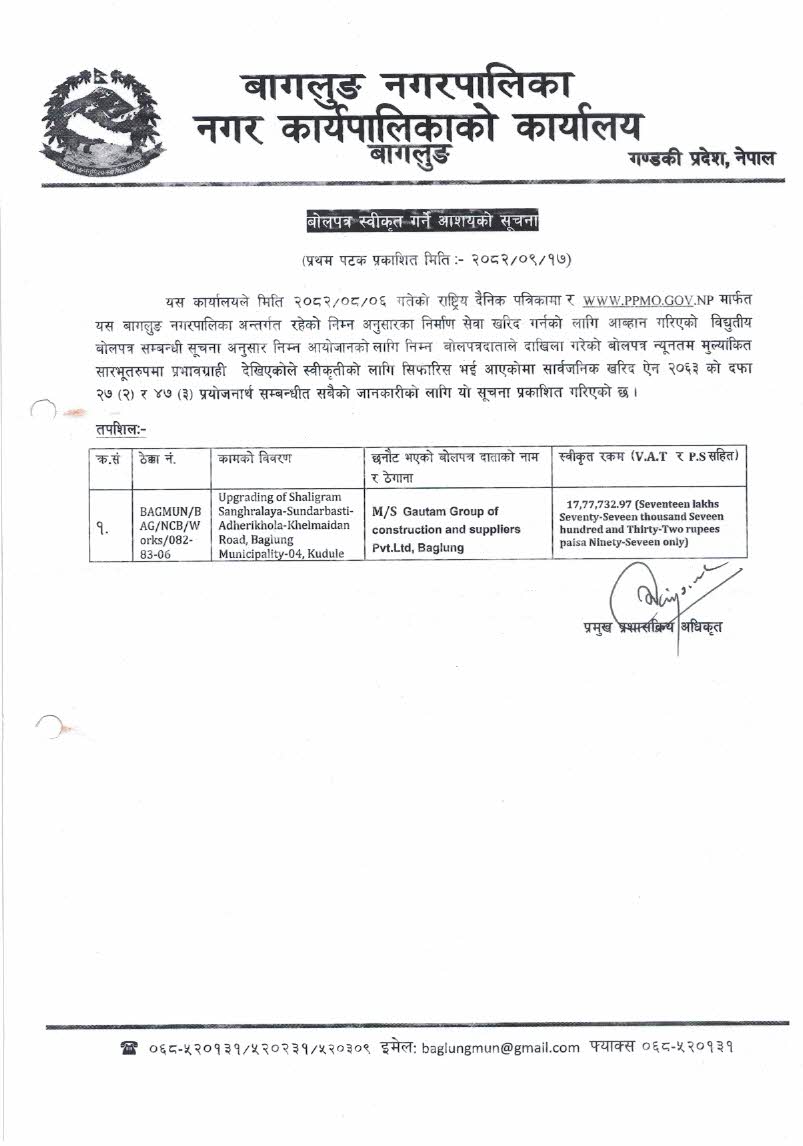 » बाेलपत्र स्वीकृत गर्ने आशयको सूचना !!!