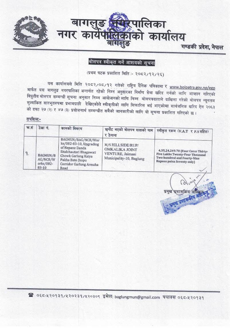 बोलपत्र स्वीकृत गर्ने सम्बन्धी सूचना !!!